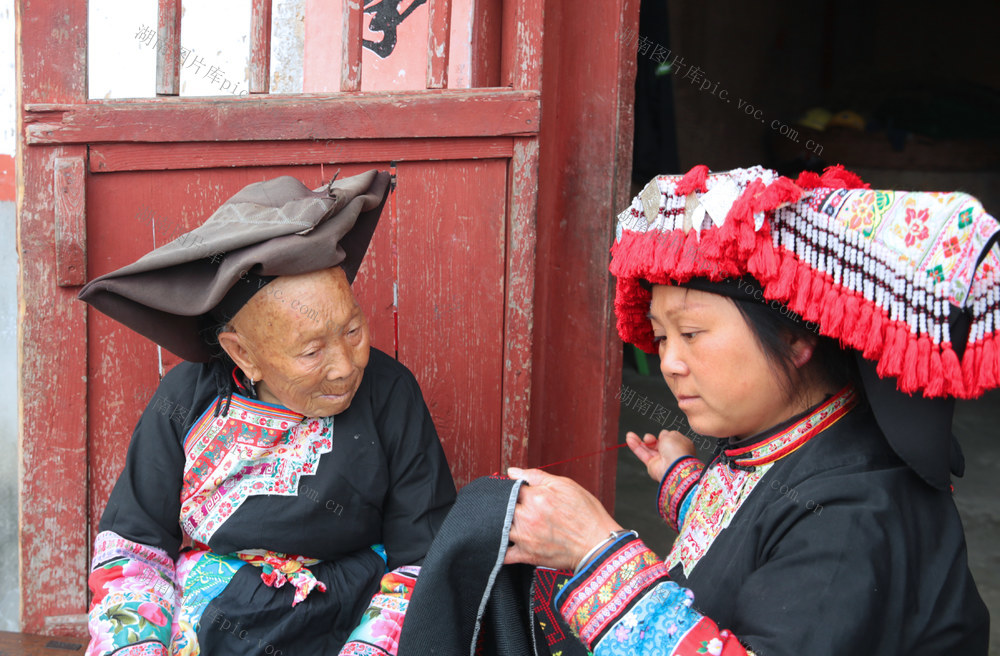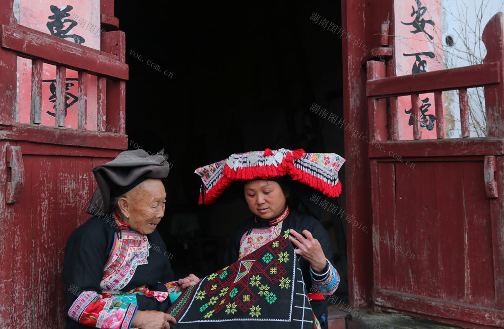 2024年5月13日,湖南省资兴市回龙山瑶族乡二峰村,现年90岁的盘乙花老奶奶正在大门口促膝指导孙媳赵丽娜学习瑶族双面刺绣。邓仁湘 摄