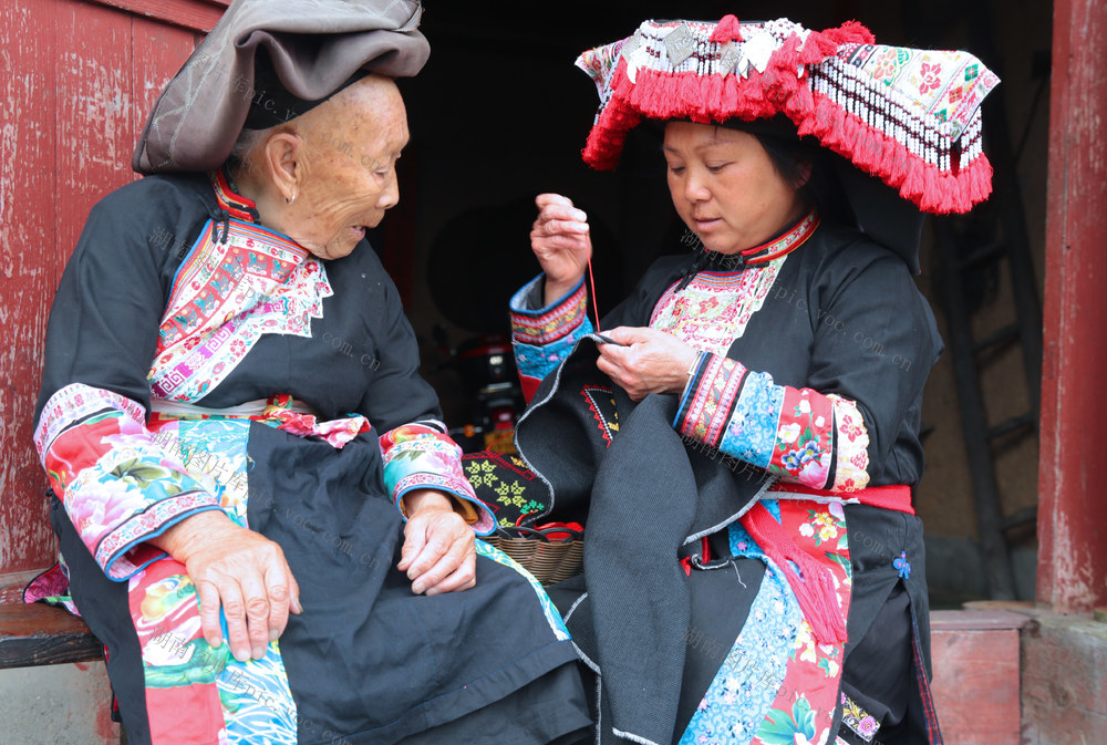 2024年5月13日,湖南省资兴市回龙山瑶族乡二峰村,现年90岁的盘乙花老奶奶正在大门口认真察看孙媳赵丽娜刺绣。邓仁湘 摄