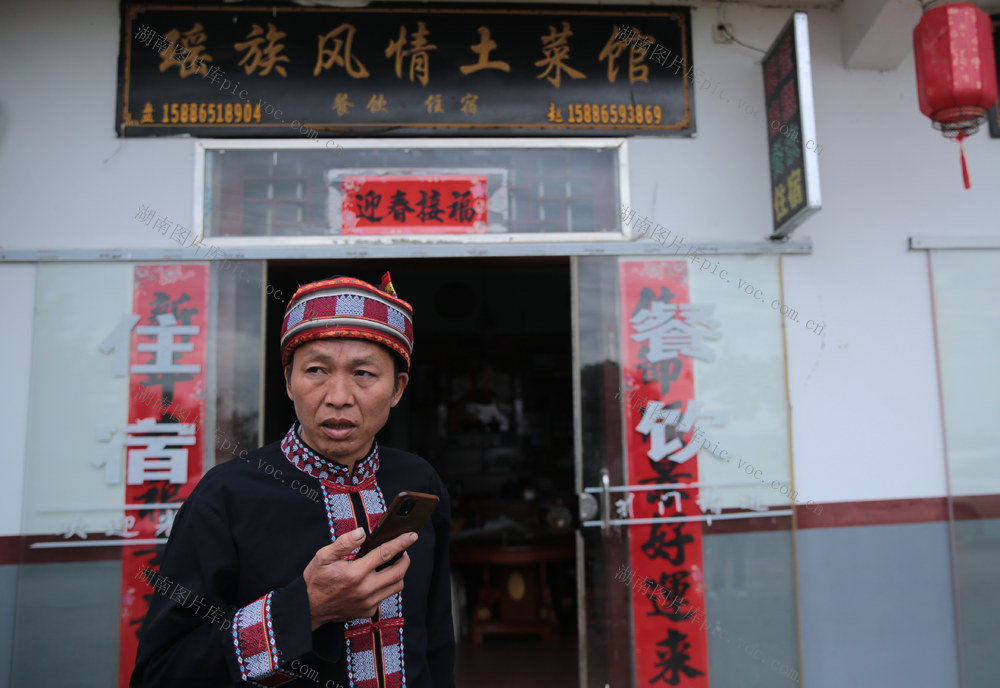 2024年5月13日,湖南省资兴市回龙山瑶族乡二峰村,盘建华穿着奶奶盘乙花绣的瑶服与客人联系业务。邓仁湘 摄