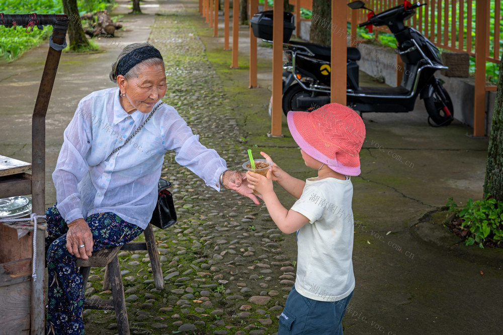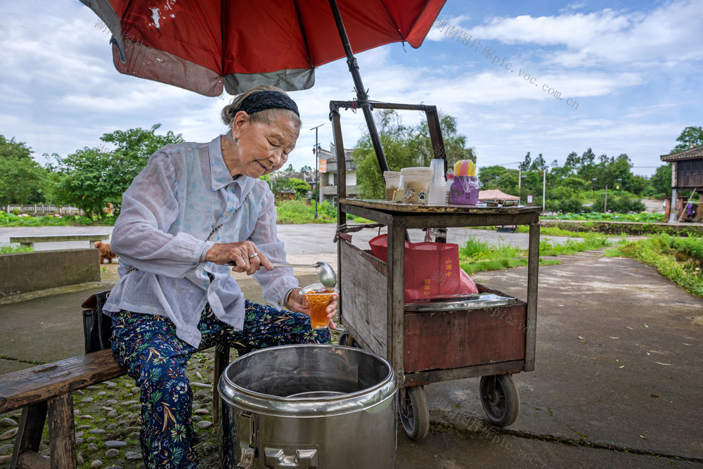 焦奶奶推着车在乡村旅游景点卖凉粉,既做点小生意,又开心快乐着。