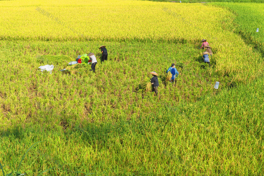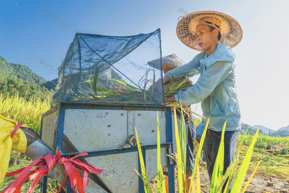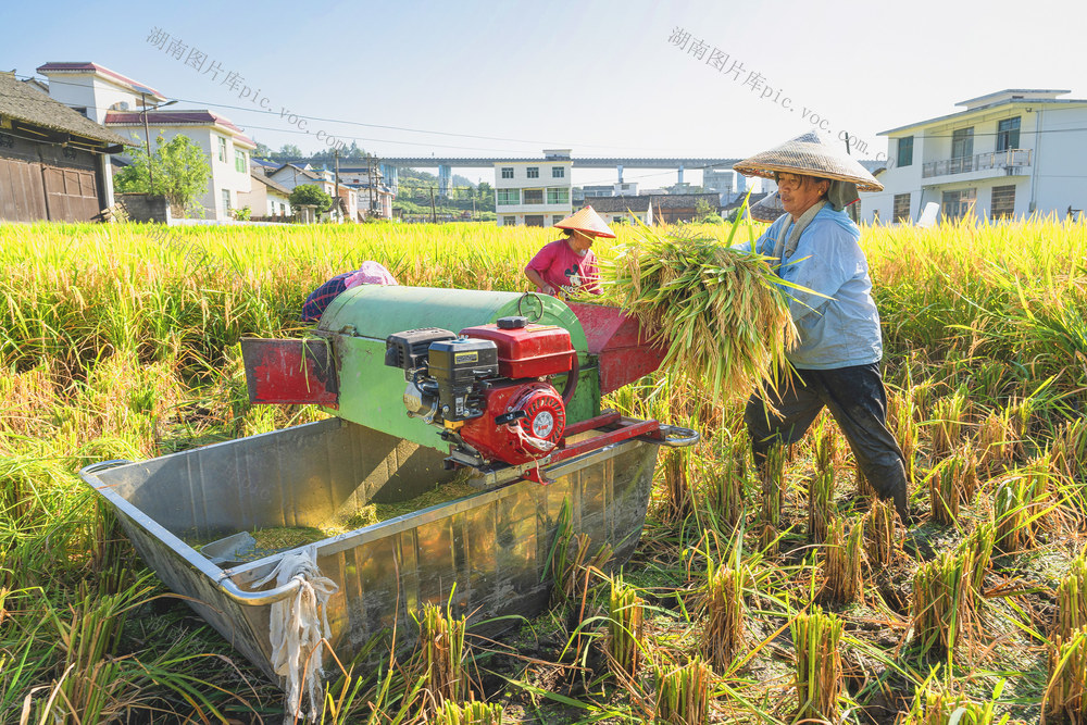圆筒形电动打谷机打谷和手工割稻。梁永鸿 摄