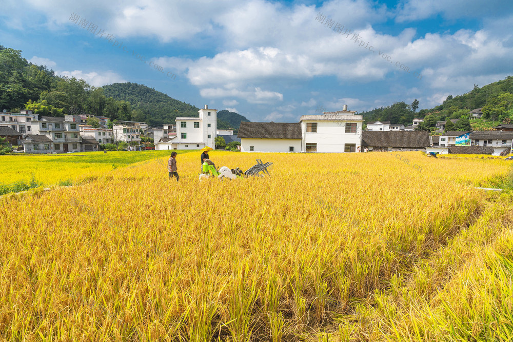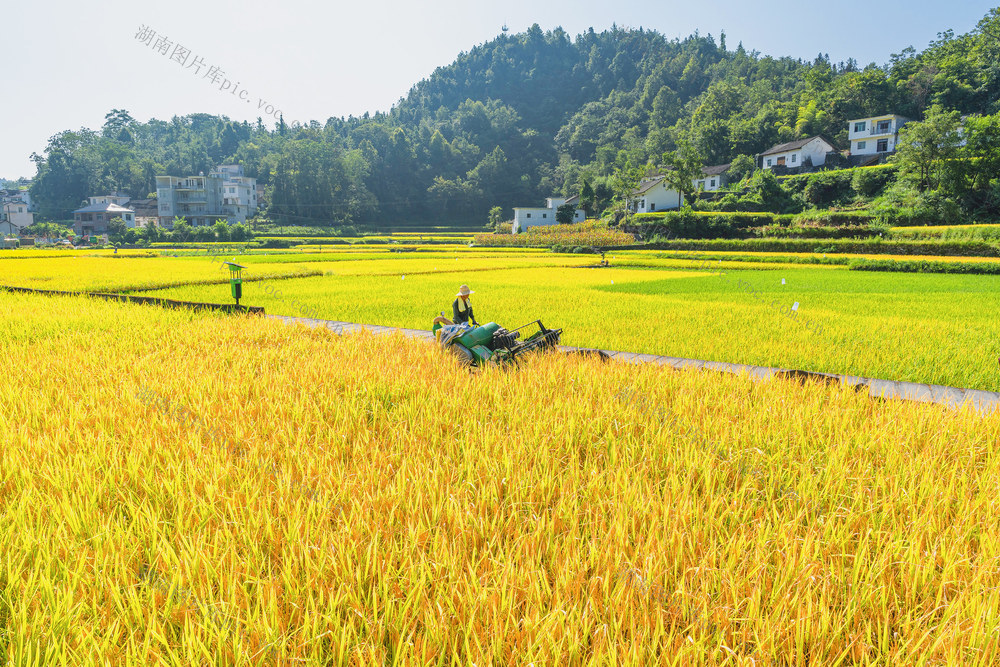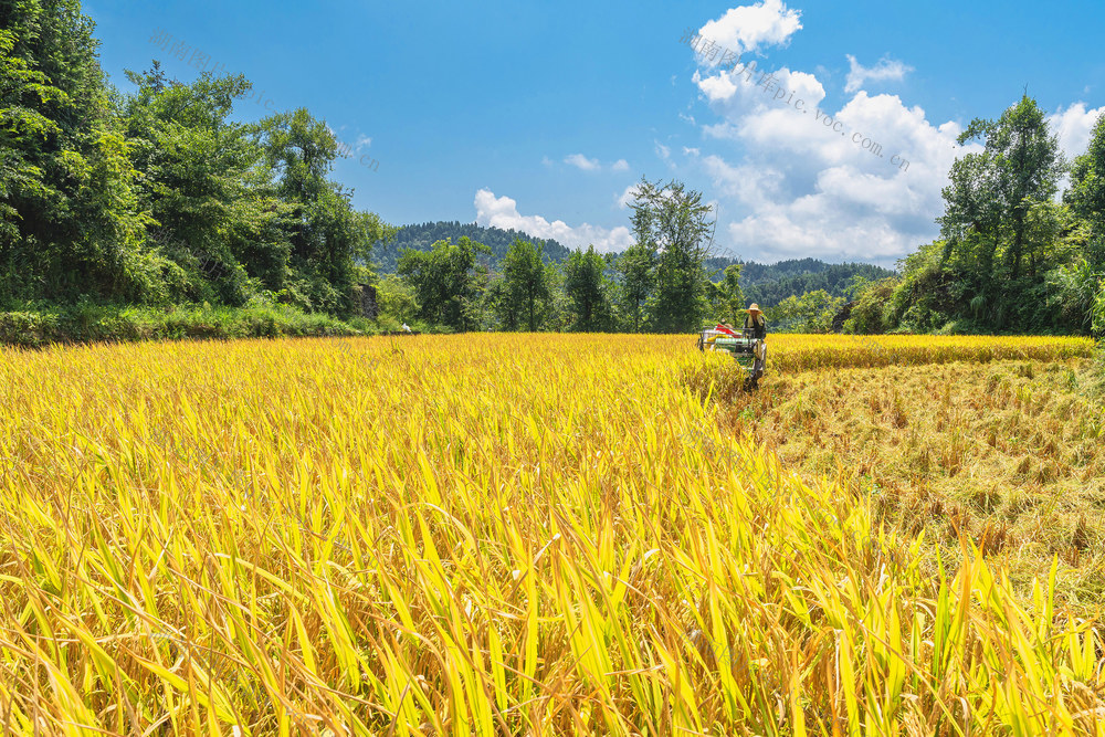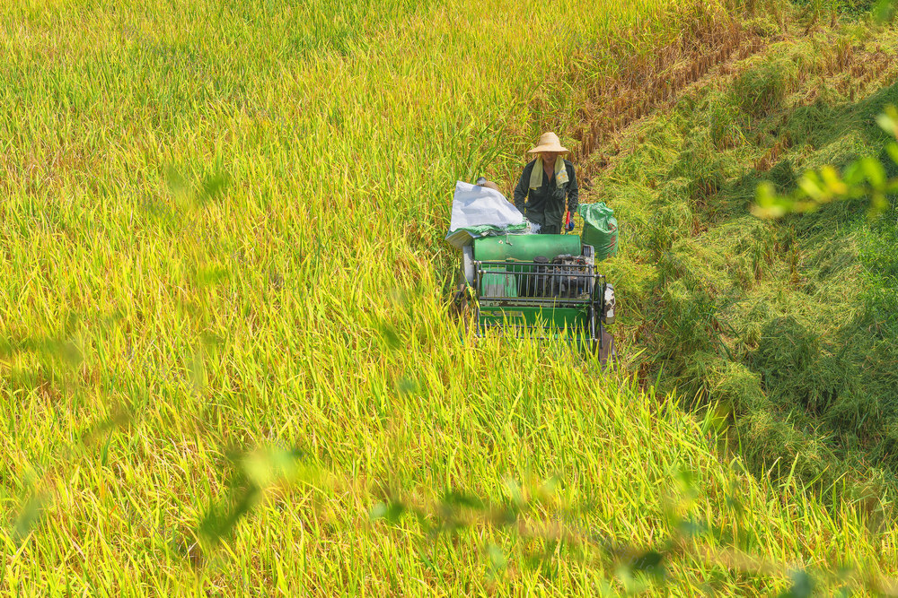 收割机收割稻谷。梁永鸿 摄