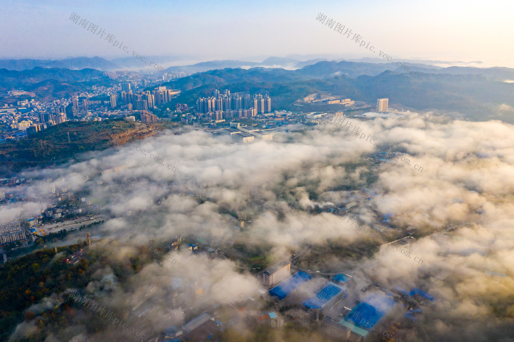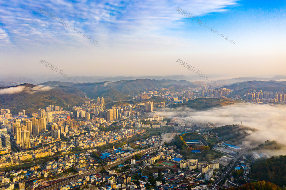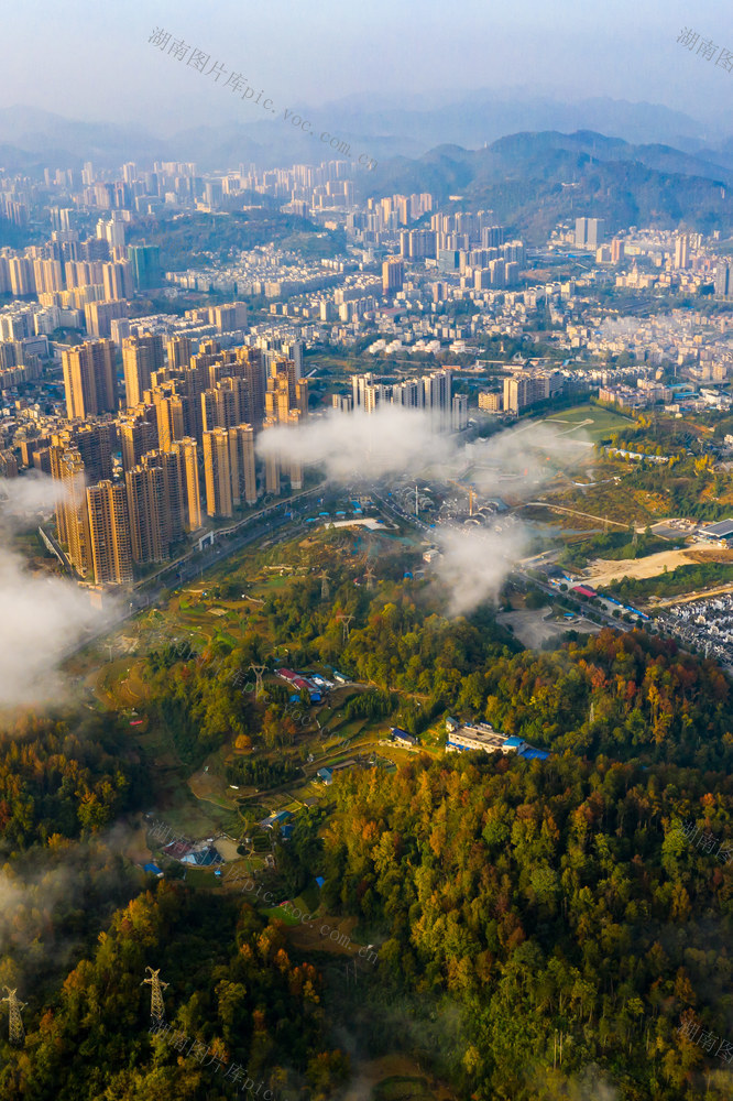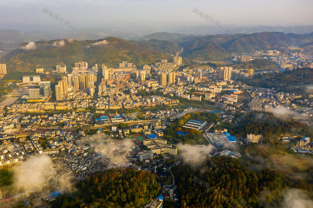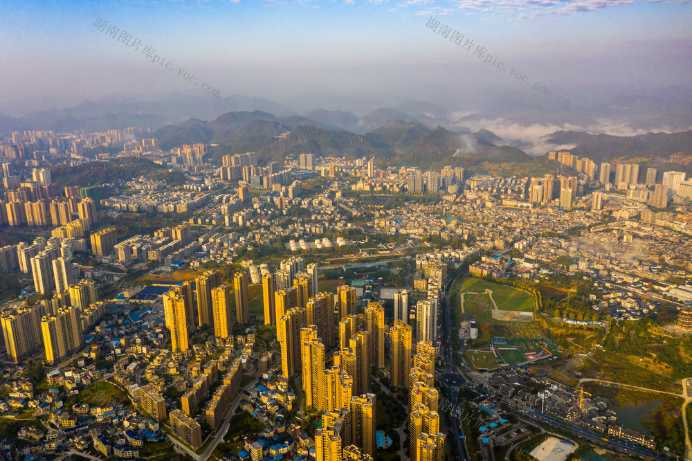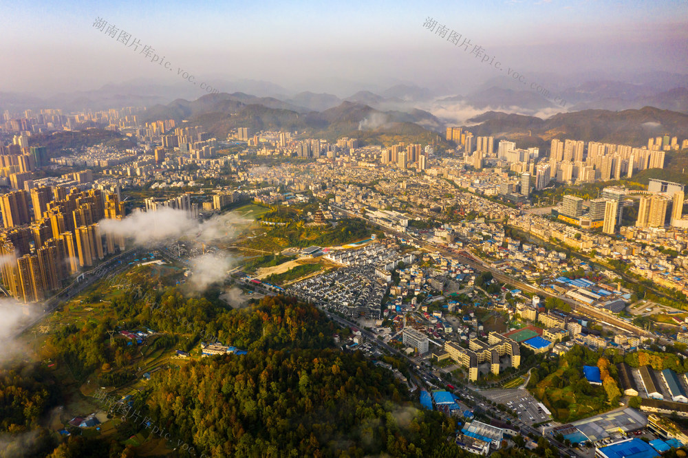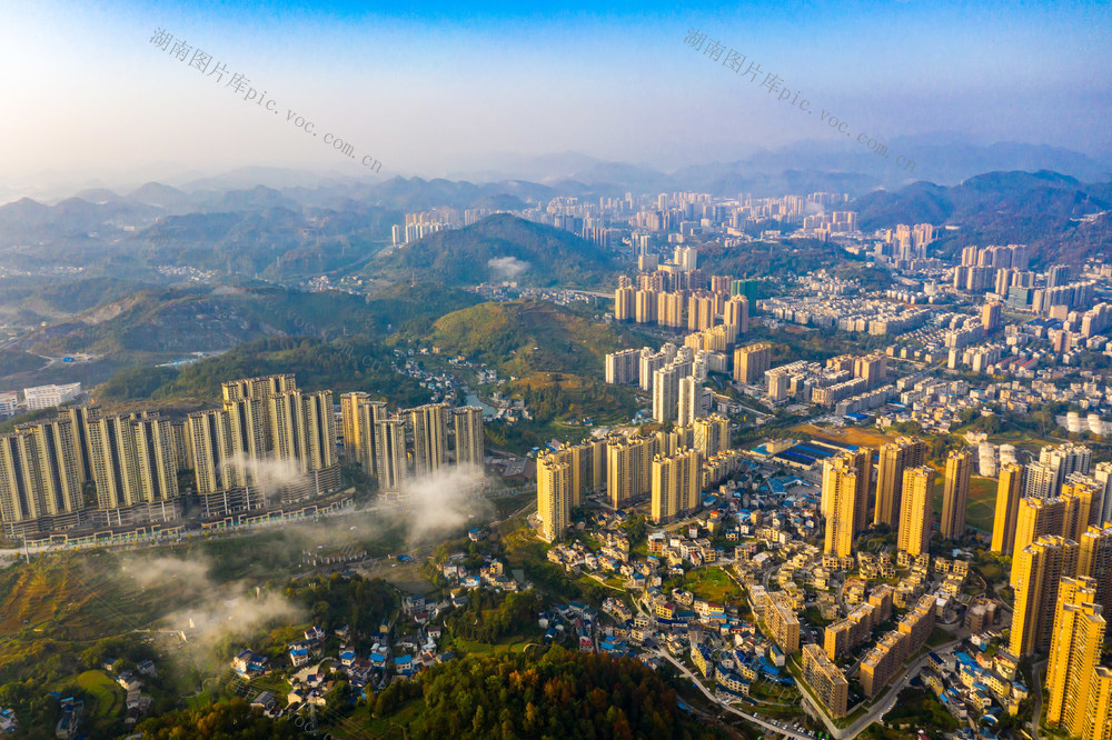 2025年11月14日,湖南省湘西土家族苗族自治州吉首市城区,高楼建筑、山林在朝阳的映衬下,呈现出一派初冬秀美风光。刘振军 摄