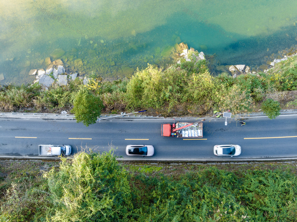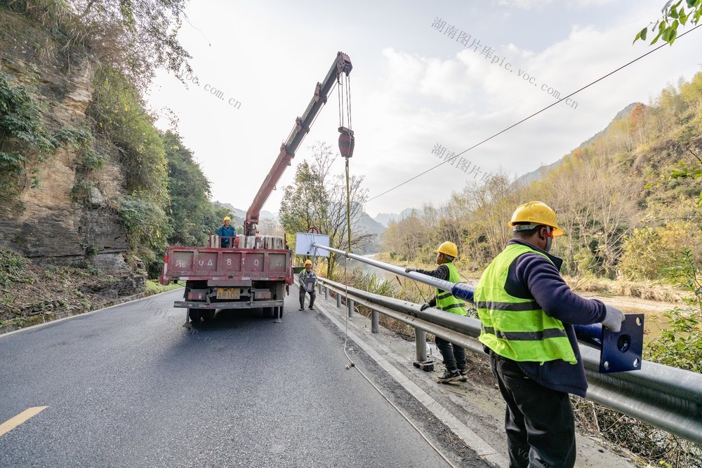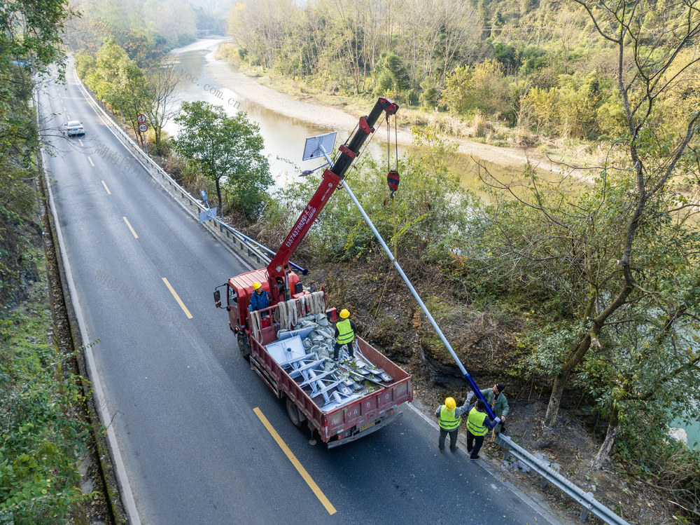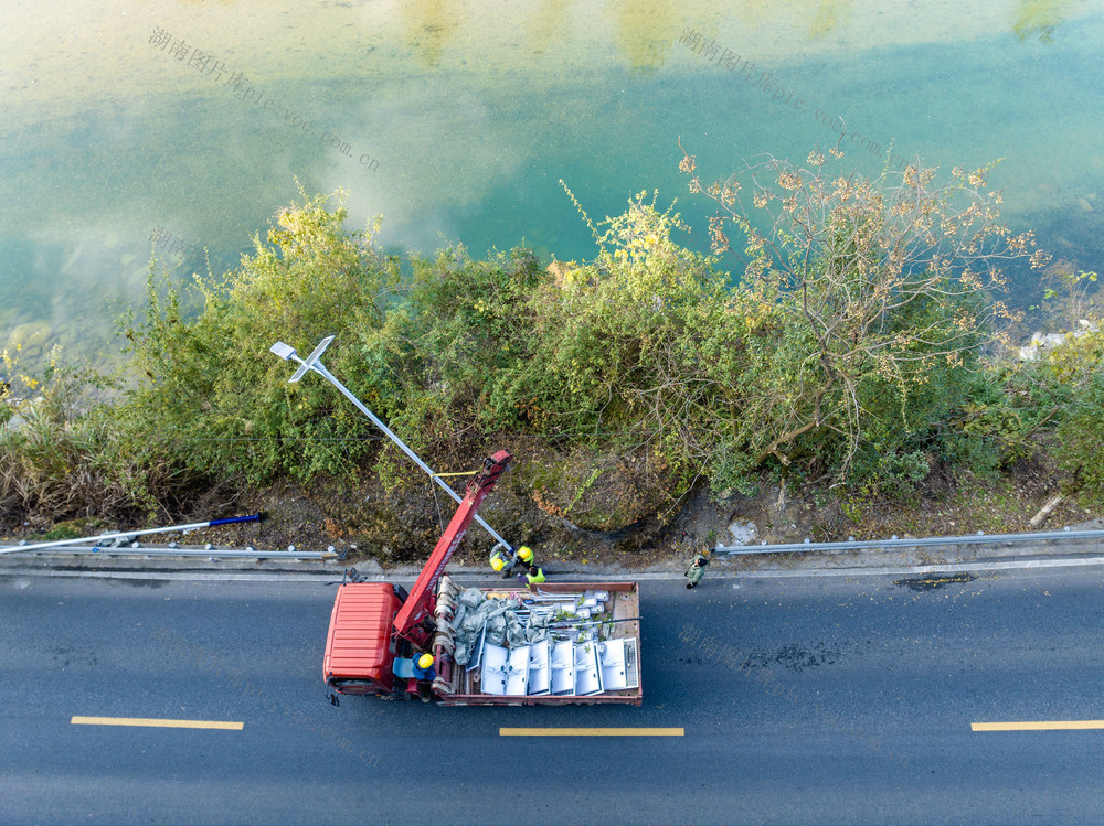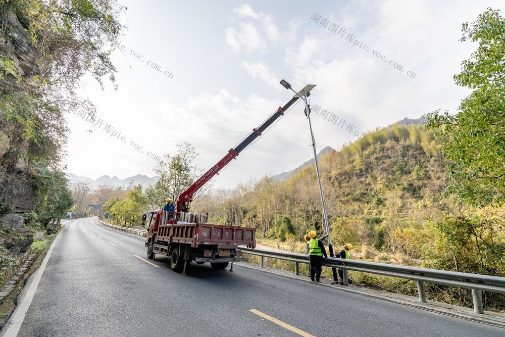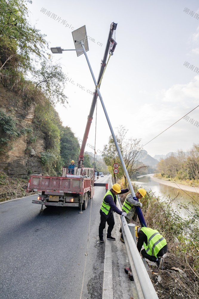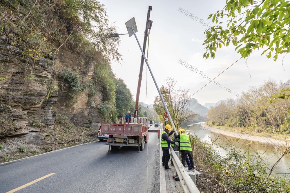 2025年12月13日,吉首市矮寨镇坪朗村,工人在G209国道安装太阳能路灯。彭璟 摄