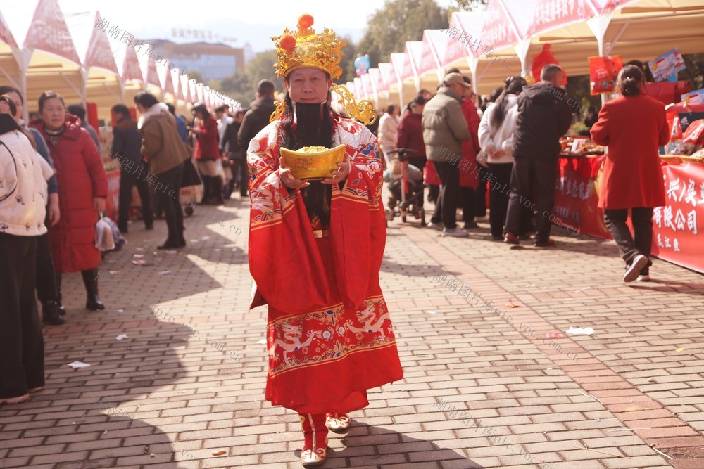 2月3日,一位身穿喜庆服装,双手捧金宝盆在资兴市年货市场游动,添上了喜庆佳节一道风景线。欧祖生 摄