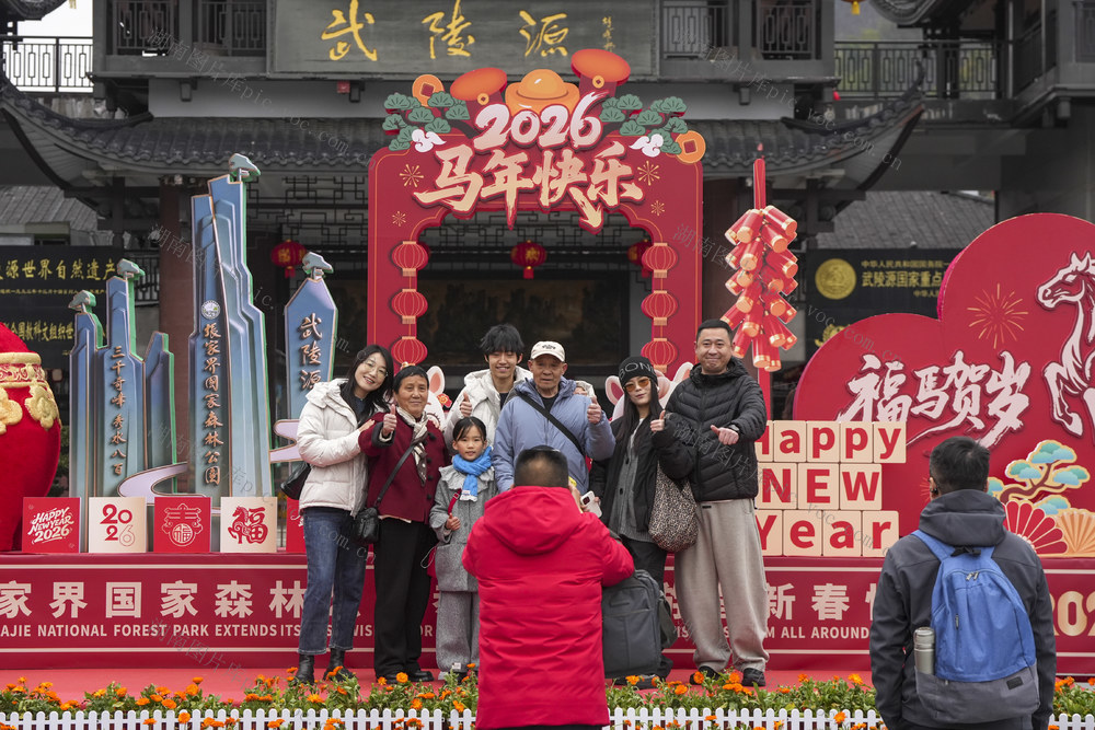 2月17日,游客们在湖南省张家界市武陵源区标志门广场与春节装扮景观墙合影留念。 邵颖 摄