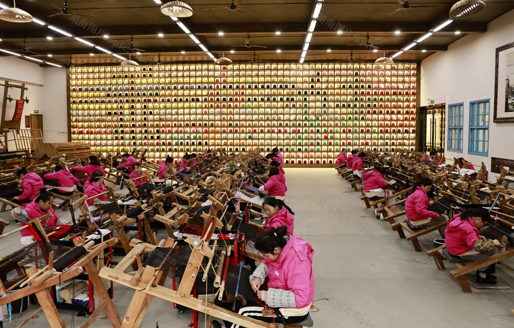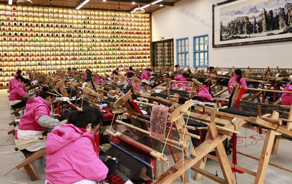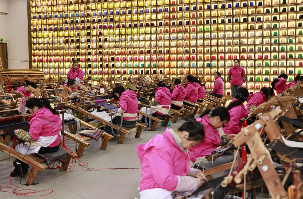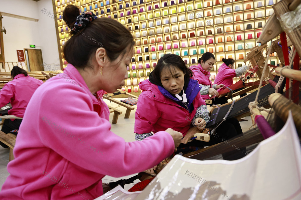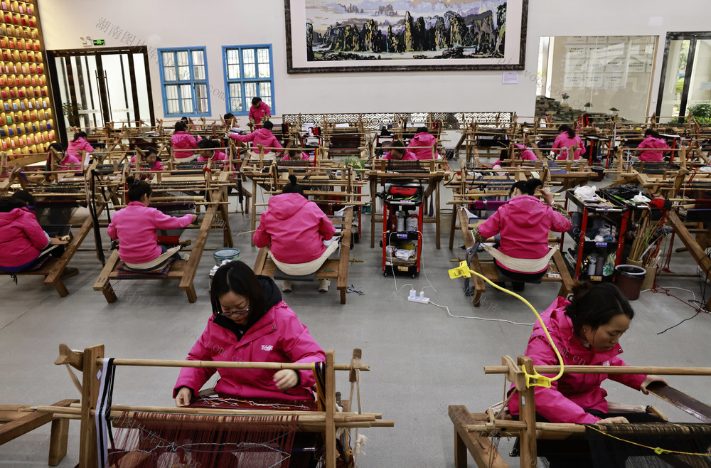 2月24日,在张家界市武陵源区乖幺妹土家族织锦生产研发基地,工人在制作土家族织锦产品。(吴勇兵摄)