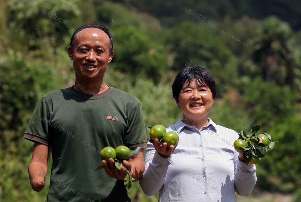 2021年10月3日,资兴市滁口镇大江村金斗塘组,53岁的黄文茂和陈安杰夫妇展示自家种植的橘子。这个村民组的部分田地被淹。村民黄文茂曾因意外失去右手,2014年成为建档立卡贫困户。在扶贫政策的帮扶下,他开荒地种水果,和村里另一名贫困户陈安杰“搭伙”扩大生产规模,一同脱贫并“脱单”。