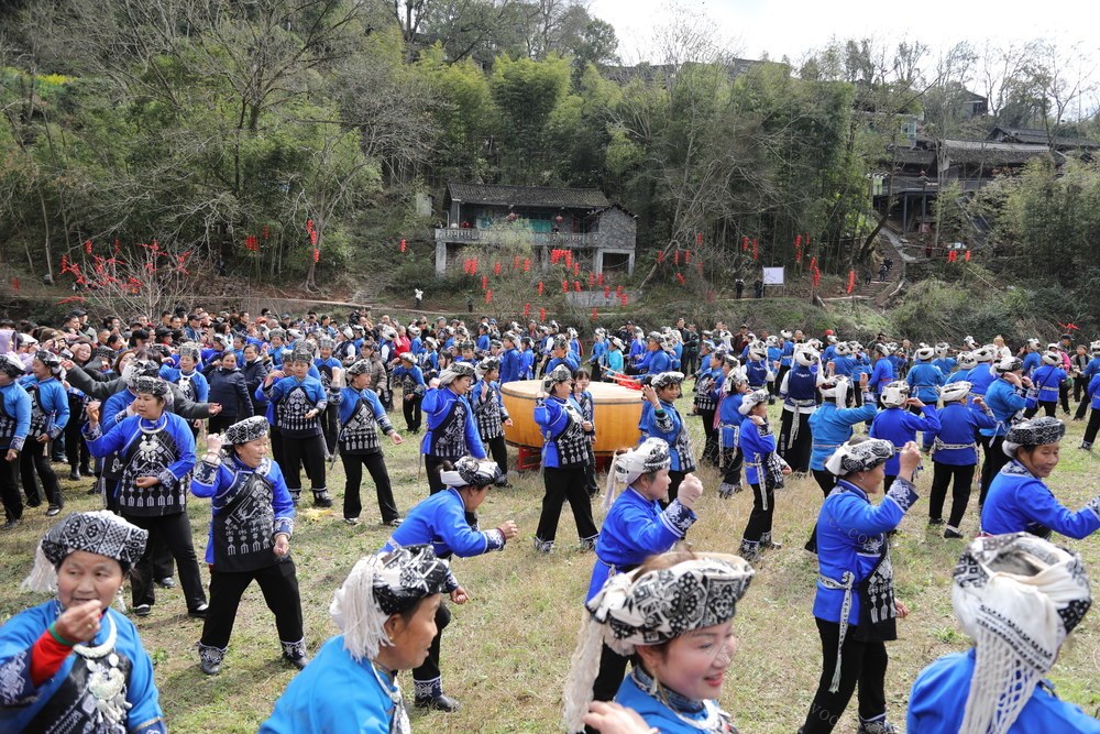 3月3日,湖南省湘西土家族苗族自治州吉首市丹青镇河坪村举办“苗族调年节”活动,村民在活动现场参加舞蹈表演,共同祈愿新年风调雨顺。张术杰 摄