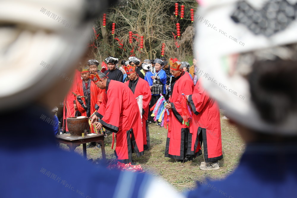 3月3日,湖南省湘西土家族苗族自治州吉首市丹青镇河坪村举办“苗族调年节”活动,村民在活动现场参加祭祀表演,共同祈愿新年风调雨顺。张术杰 摄