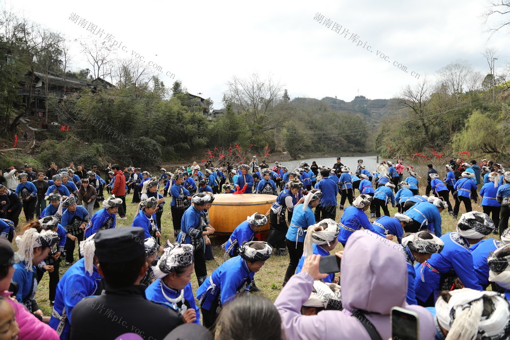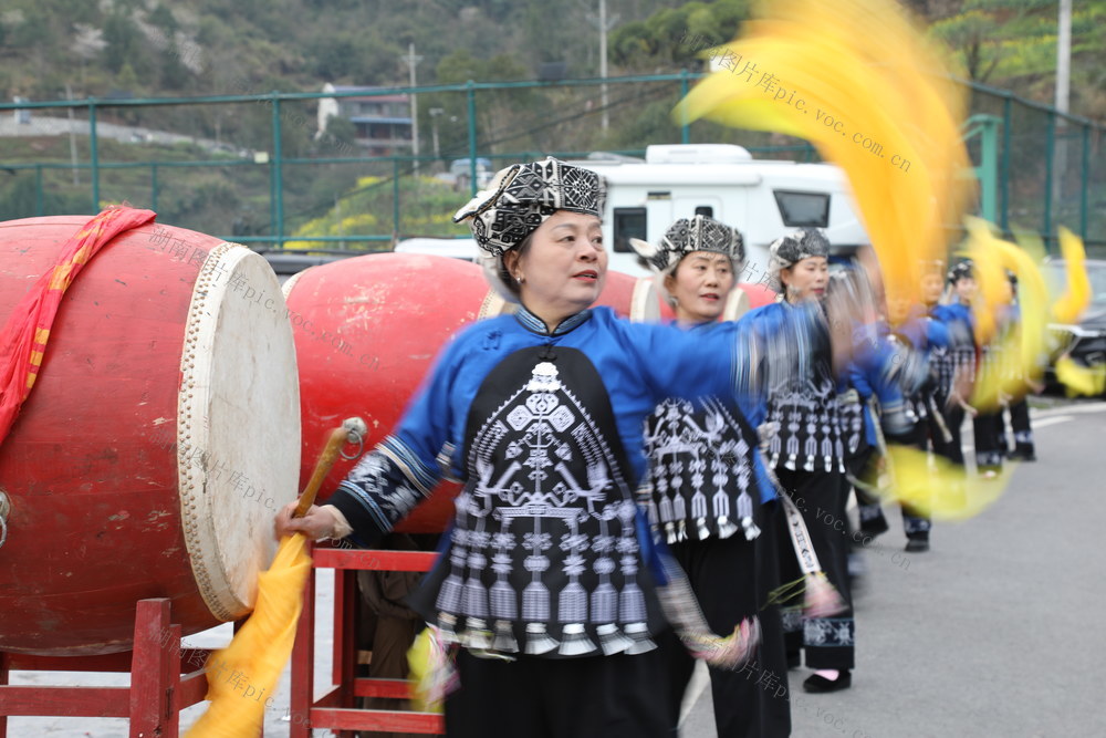 3月3日,湖南省湘西土家族苗族自治州吉首市丹青镇河坪村举办“苗族调年节”活动,村民在活动现场表演鼓舞,共同祈愿新年风调雨顺。张术杰 摄