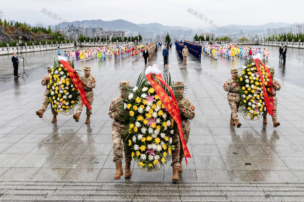 2026年3月31日,湘西州吉首市烈士公园,州、市退役军人事务局代表向烈士纪念碑敬献鲜花。 彭璟 摄