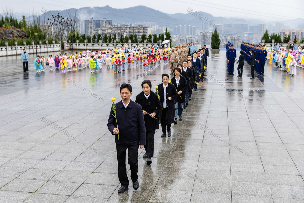 2026年3月31日,湘西州吉首市烈士公园,师生代表向烈士纪念碑敬献鲜花。 彭璟 摄
