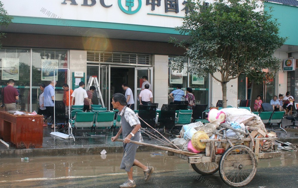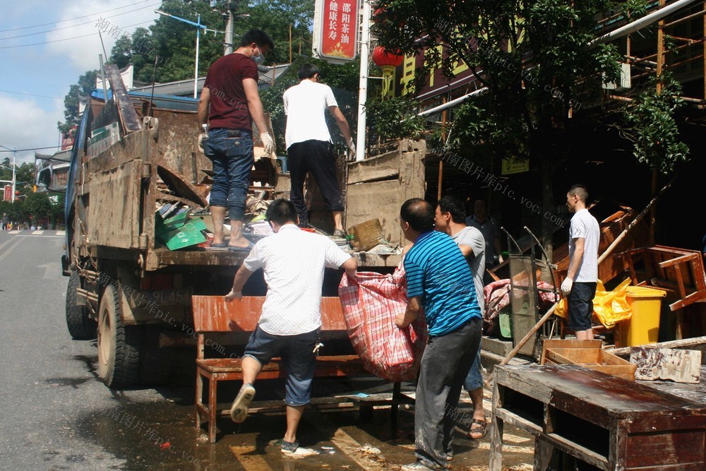 2017年7月3日,邵阳县城繁华的邵新街被洪水浸漫过的房屋、店铺、街道上,呈现一群群党员干部和群众清理垃圾、有序进行大清扫的动人画面。黎建成 摄