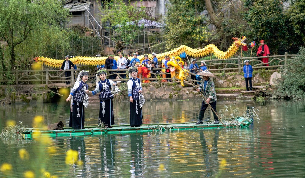 图为苗族同胞在竹排上放歌。 陈明来 摄