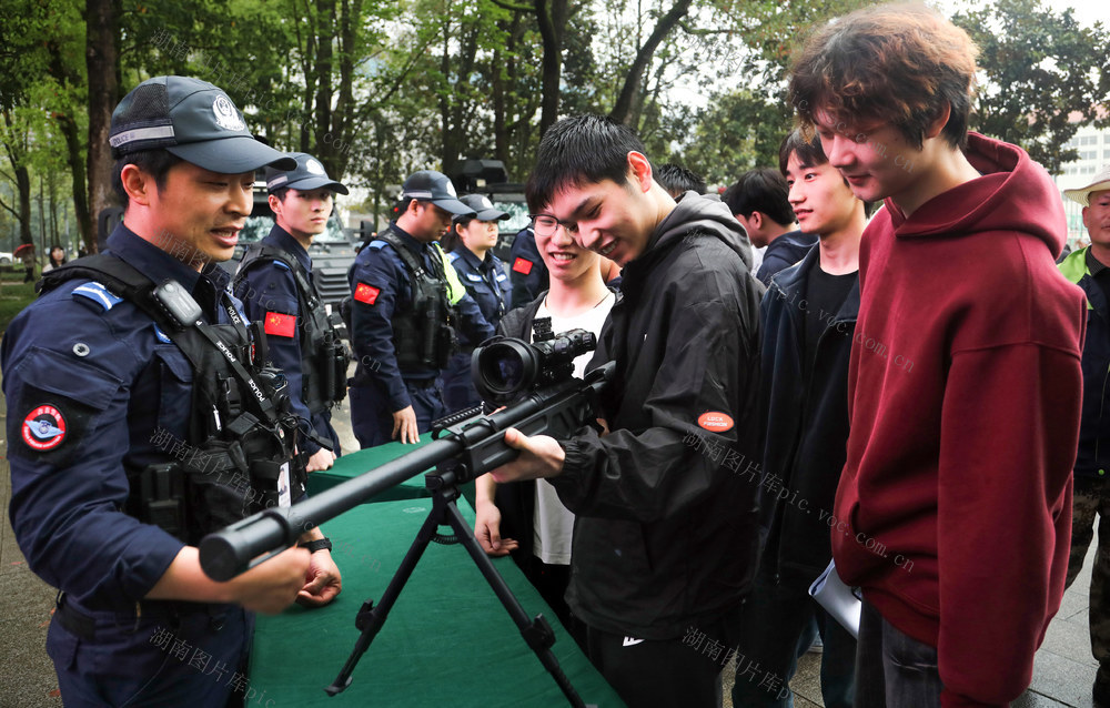 4月8日,吉首大学吉首大学(砂子坳校区),民警为学生介绍警用枪械使用知识。刘丹 姚方 摄影报道