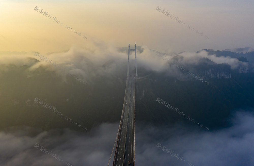 2021年8月22日,湘西土家族苗族自治州吉首市矮寨镇,矮寨特大悬索桥云海翻腾,车辆如在云中穿梭,宛如仙境。辜鹏博 摄