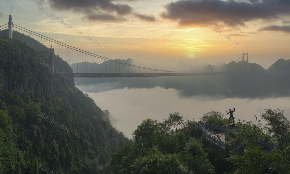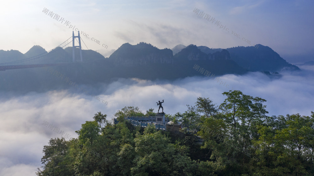 2021年8月22日,湘西土家族苗族自治州吉首市矮寨镇,川湘公路矮寨开路先锋纪念碑与矮寨大桥遥相呼应。当天,矮寨特大悬索桥云海翻腾,宛如仙境。辜鹏博 摄