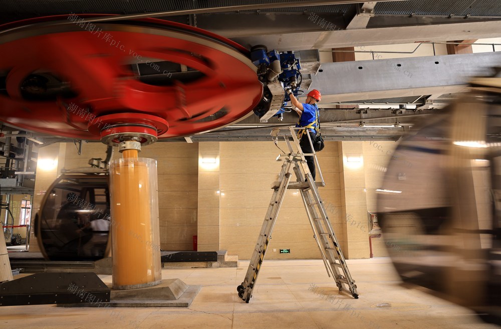 5月1日,湖南张家界市武陵源区天子山索道工作人员在巡检设备。 吴勇兵 摄