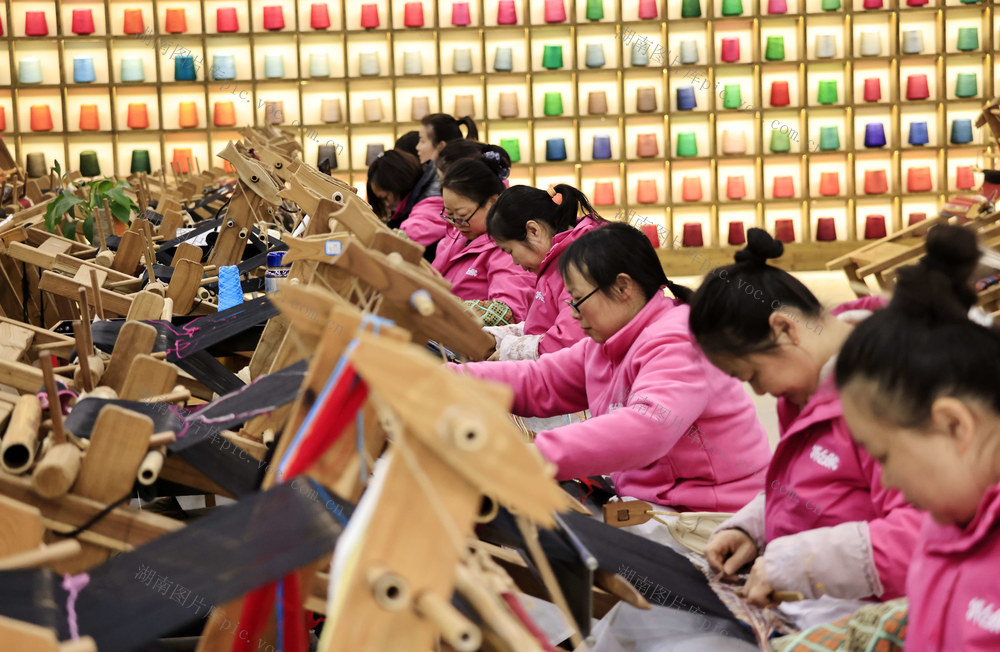 2月24日,在张家界市武陵源区乖幺妹土家族织锦生产研发基地,工人在制作土家族织锦产品。(吴勇兵摄)