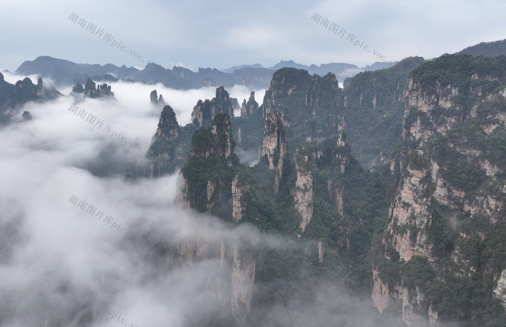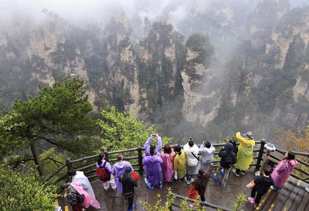 2026年4月15日,游人在云雾缭绕的张家界国家森林公园游览。 吴勇兵 摄