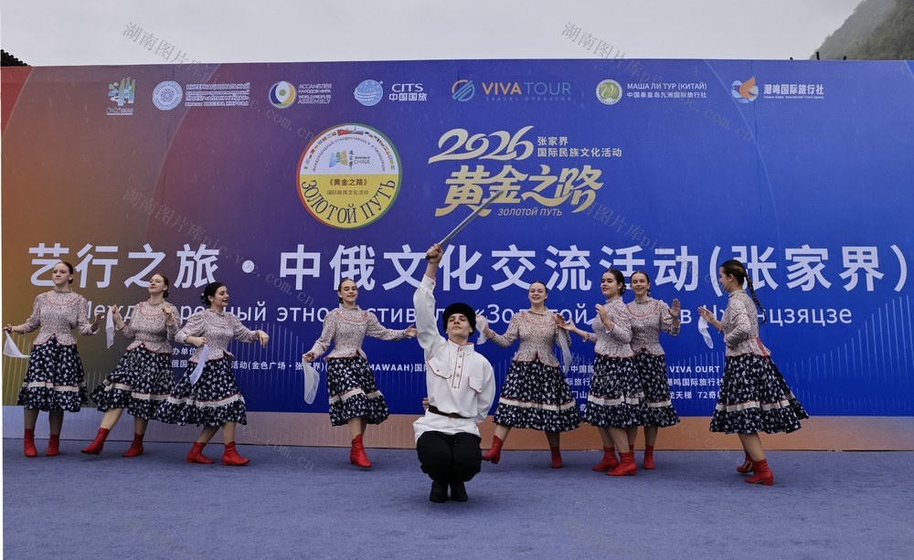 2026年4月12日,在湖南省张家界市武陵源区,俄罗斯艺术表演团体在表演节目。(吴勇兵摄)